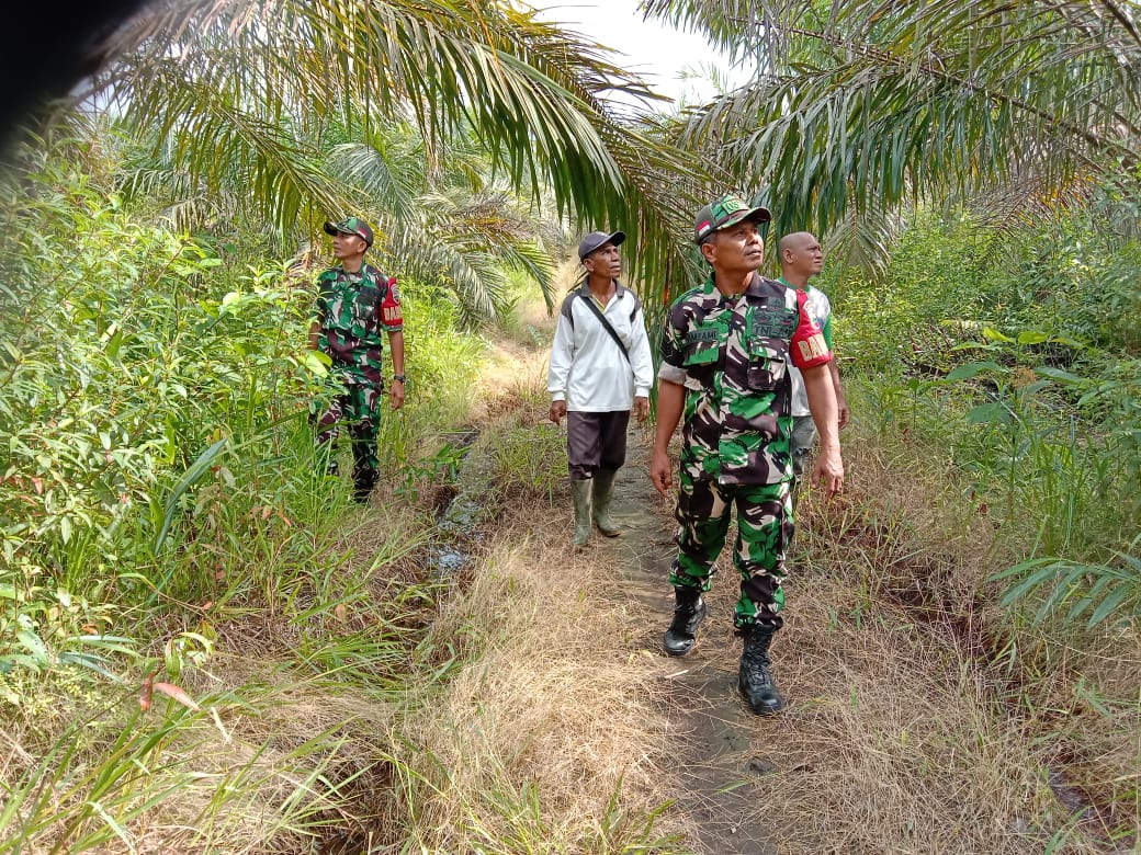SIAK- Babinsa Koramil 01/Siak Kodim 0322/Siak dengan tiga warga Kampung Dayun berpatroli karhutla disejumlah areal lahan yang dianggap rawan kebakaran pada Rabu, 10 Agustus 2022.