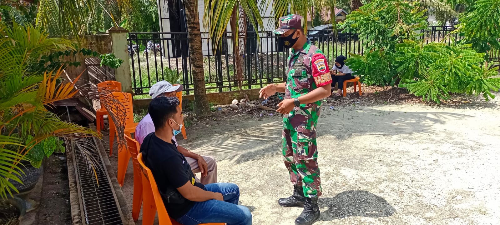SIAK- Babinsa Koramil 01/Siak Kodim 0322/Siak Serda Jhon A. Simatupang melaksanakan Komsos dengan masyarakat dengan mengajak warga Desa binaan tetap mematuhi protokol kesehatan, saat melaksanakan komunikasi sosial (komsos) di Kampung Benteng Hulu, Kecamatan Mempura, Kabupaten Siak, Kamis (6/10/2022).