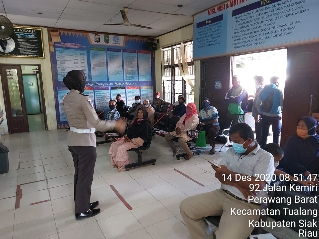 “Tempat cuci tangan dan sabun, Menempatkan petugas yang melaksanakan pengukuran suhu bagi wajib pajak yang datang, menempatkan kursi tunggu yang diberi tanda berjarak, meletakkan handsanitizer di ruang pelayanan, Petugas menghimbau kepada WP yang sedang menunggu pengurusan untuk selalu memperhatikan prokes cegah covid 19 dengan selalu menggunakan masker dan menjaga jarak,”kata Kapolres Siak AKP Rosna Meilani .