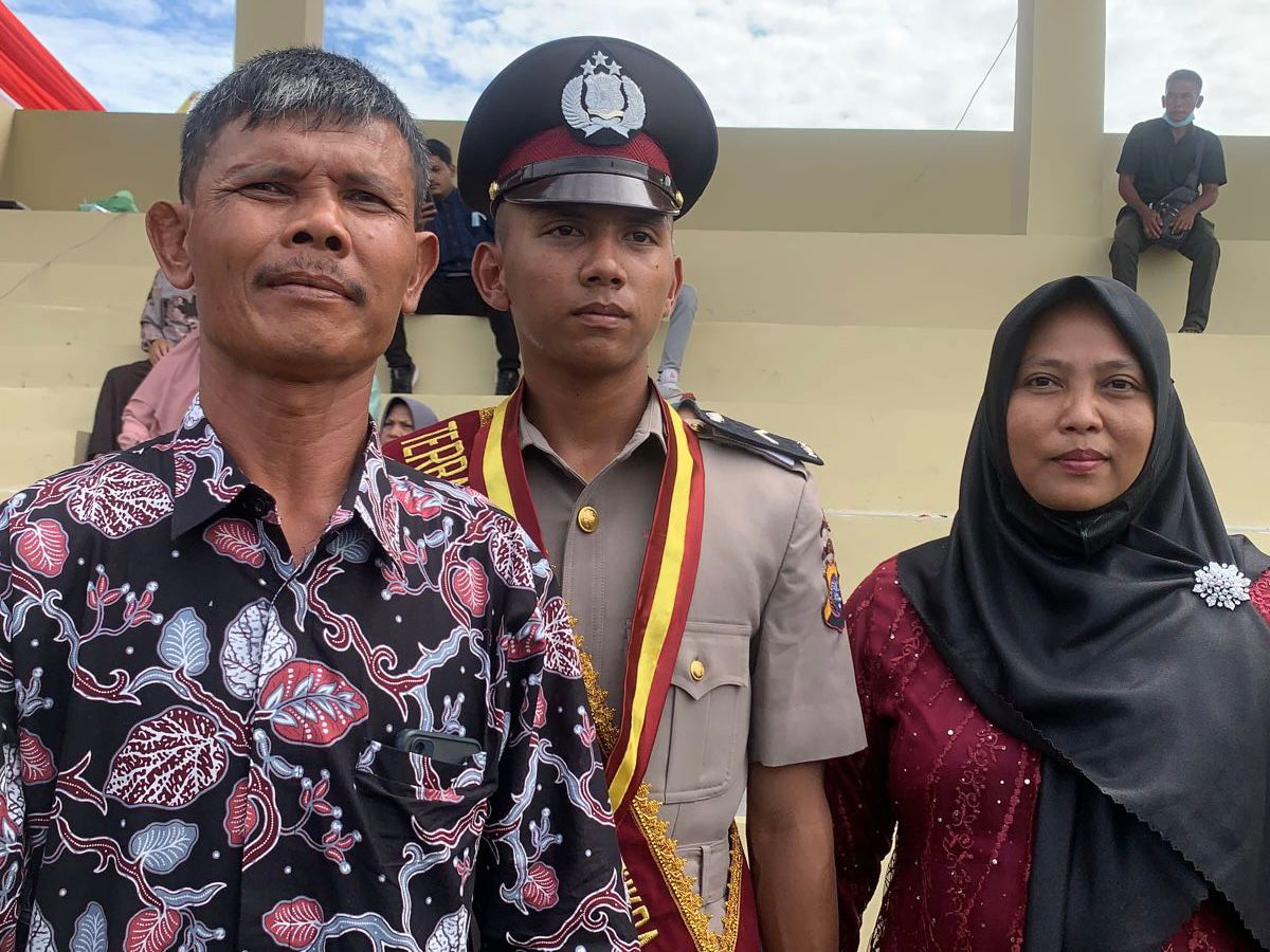 “Saya hanya tukang las yang bekerja di bengkel orang. Penghasilan rata-rata 3 juta per bulan. Sangat bangga anak saya bisa masuk polisi. Dan saya tidak ada mengeluarkan uang sepeserpun, memang anak saya ini orang yang gigih,” ucap Taslim.
