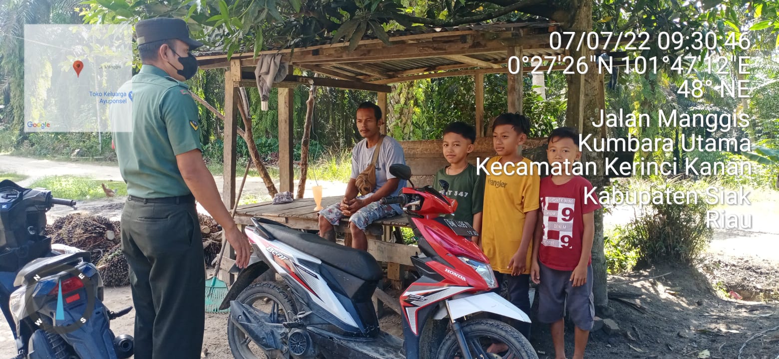 SIAK- Babinsa Koramil 01/Siak jajaran Kodim 0322/Siak Serda Ulong Ritonga melaksanakan kegiatan Protkes menghimbau kepada masyarakat Kampung Kumbara Utama Kecamatan Kerinci Kanan Kabupaten Siak. Kegiatan dilaksanakan pada. Kamis, 07 Juli 2022.