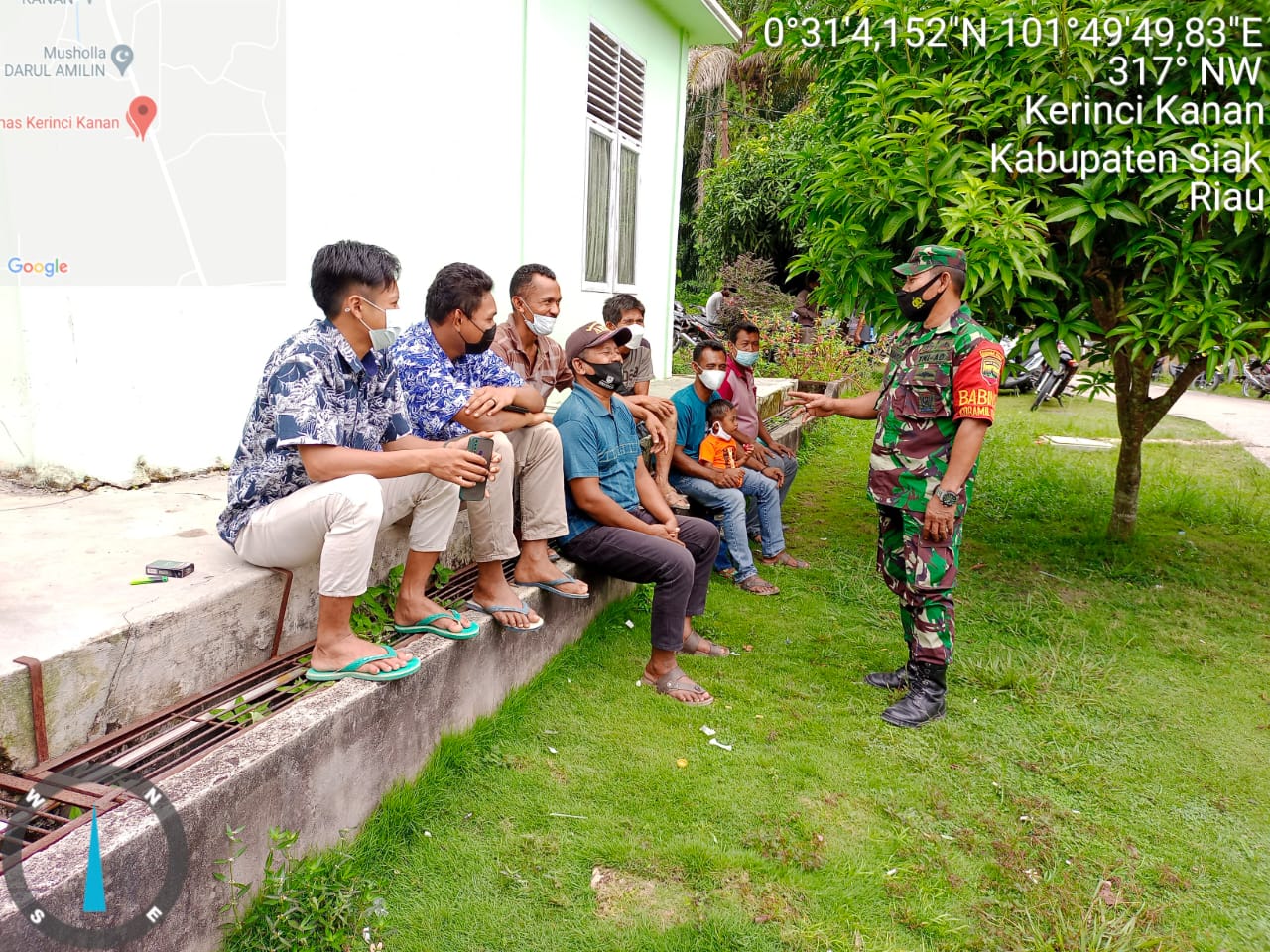 SIAK- Babinsa Koramil 01/Siak jajaran Kodim 0322/Siak Serma Erianto melaksanakan kegiatan Protkes menghimbau kepada masyarakat Kampung Kerinci Kanan Kecamatan Kerinci Kanan Kabupaten Siak. Rabu,16 Maret 2022.