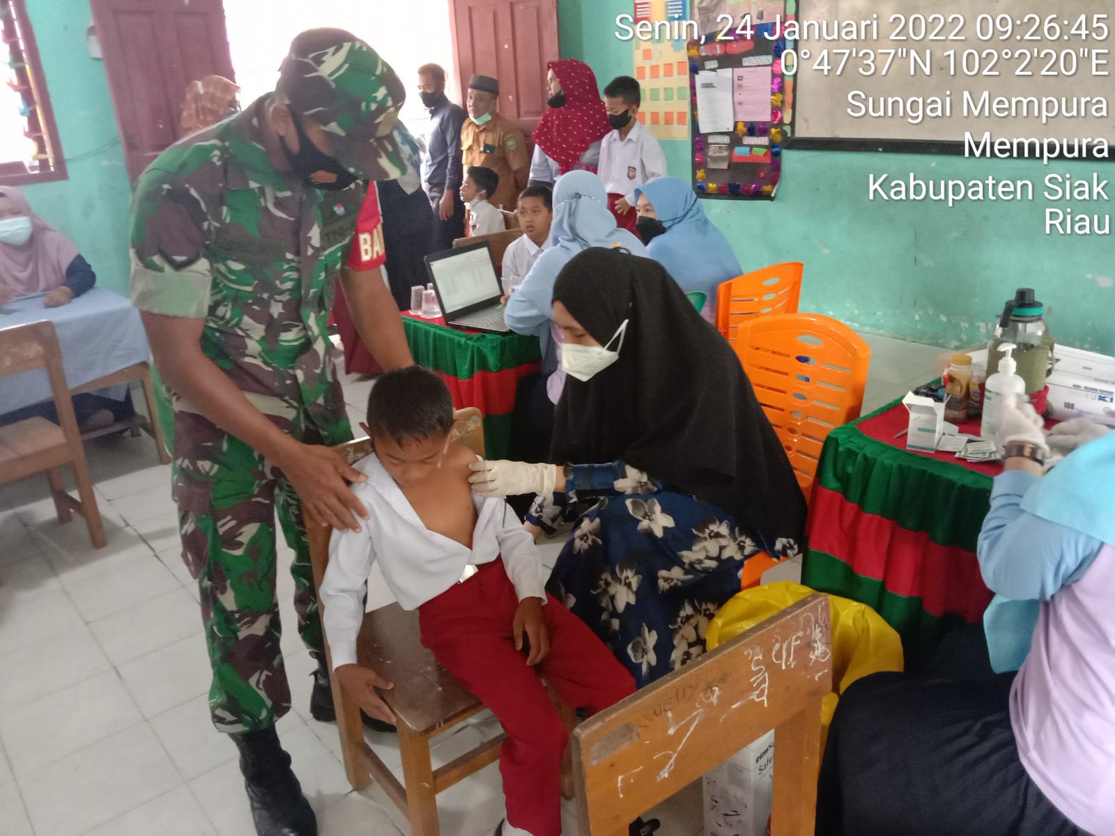 SIAK- Dalam melakukan sejumlah upaya strategis guna mengakselerasi program vaksinasi COVID-19 untuk anak usia 6-11 tahun di wilayah teritorial Kodim 0322/Siak, Anggota Koramil 01/Siak jajaran Kodim 0322/Siak Serda JAM Simatupang bersma Bhabinkamtibmas melaksanakan kegitan pengamanan serbuan Vaksinasi Dosis ke 1 jenis Sinovac yang bertempat di SD Negri 002 Kelurahan Sungai Mempura, Kecamatan Mempura, Kabupaten Siak. Senin, (24 Januari 2022).