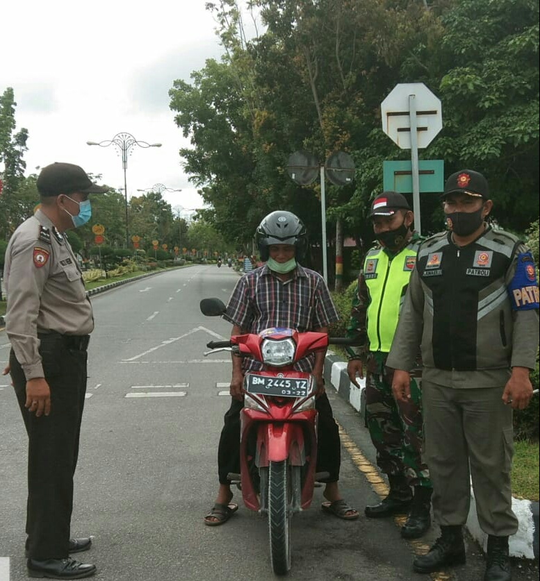 Siak Sri Indrapura – Babinsa Koramil 03/Siak Kodim 0303/Bengkalis Kopda Ardi bersama Polsek Siak dan Satpol PP Siak melaksanakan Operasi yustisi pendisiplinan protokol kesehatan dan penegakan hukum. Kegiatan Operasi Yustisi ini bertempat di Jalan Raja Kecik Kelurahan Kampung Rempak, Kecamatan Siak Kabupaten Siak. Kamis, (17/12/2020).