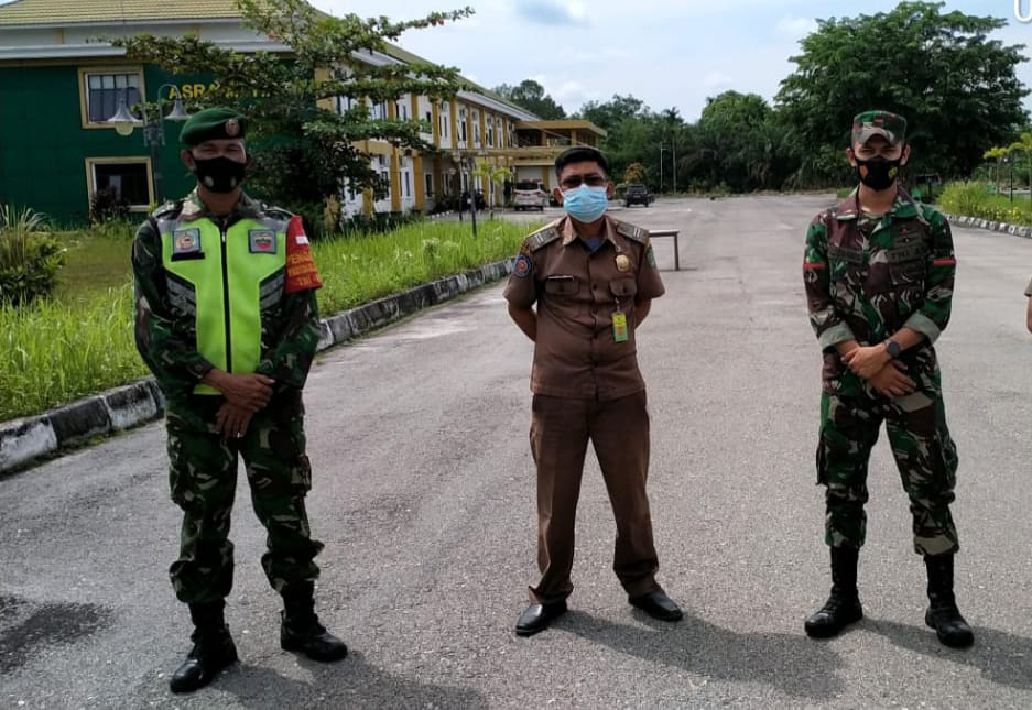 Siak Sri Indrapura – Anggota Koramil 03/Siak bersama Anggota Satpol PP Laksanakan siaga ditempat Isolasi pasien Covid-19 Asrama Haji yang terletak di Kel. Kampung Rempak Kec. Siak Kab. Siak.