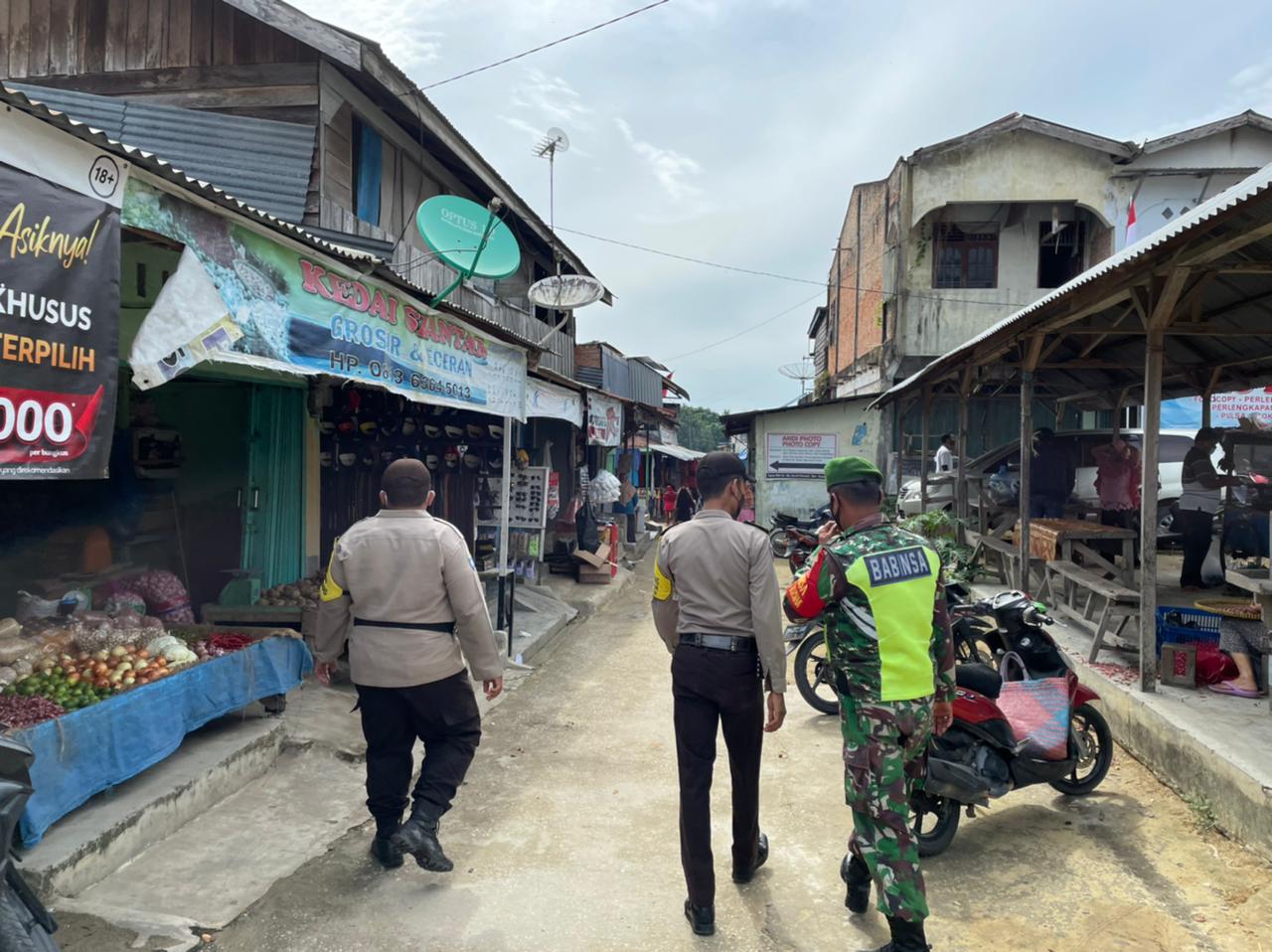 Dayun – Guna menekan dan mengendalikan penyebaran Covid-19, Aparat gabungan di Kecamatan Dayun terdiri dari Anggota Koramil 03/Siak,Polsek Siak dan Satpol PP, melaksanakan operasi Yustisi dalam rangka penegakkan disiplin Pemberlakuan Pembatasan Kegiatan Masyarakat (PPKM) Level 3 diwilayah Kampung Pasar Dayun dan Pasar km 55 Banjar Seminai Kecamatan Dayun Kabupaten Siak, Rabu (25/08/2021).