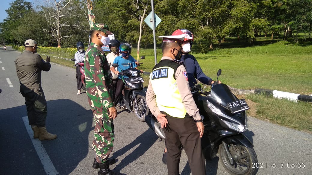 “Pukul 07.00 Personil TNI, Polri, Dishub dan Pol-PP melaksanakan Pembatasan Mobilitas & Penyekatan guna pencegahan penyebaran Virus Covid 19 di Pos PPKM Darurat Kecamatan Mempura Kab. Siak,” kata Serda Darwis.