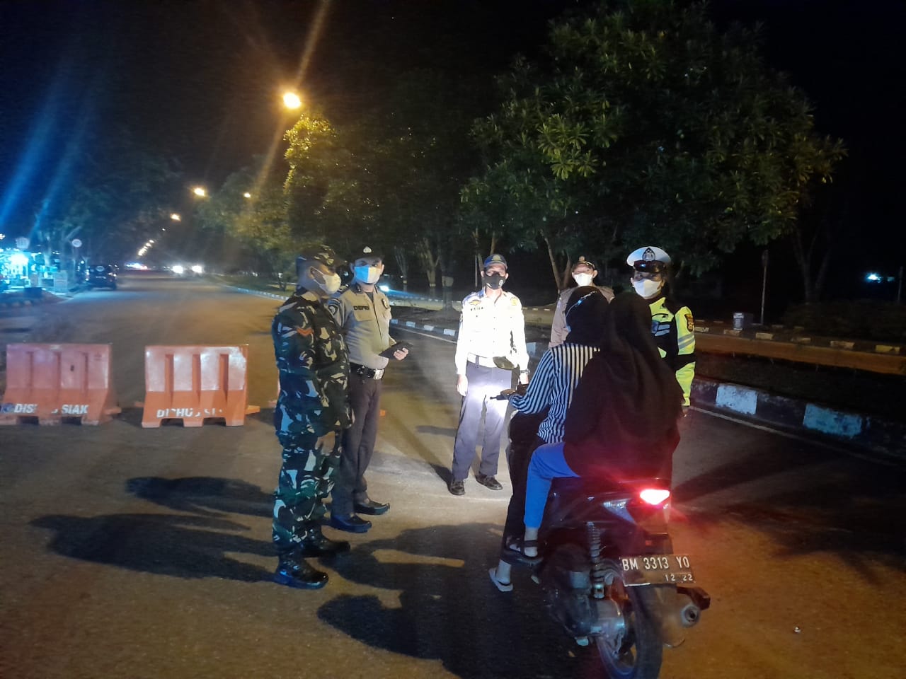 Siak Sri Indrapura – Berbagai upaya mencegah penyebaran Covid-19 terus dilakukan oleh Personil gabungan Koramil 03/Siak, Polsek Siak,Diahub dan Satpol PP Kab. Siak di Bundaran Kwalian Kelurahan Kampung Rempak Kecamatan Siak Kabupaten Siak, Sabtu (07/08/2021), Malam