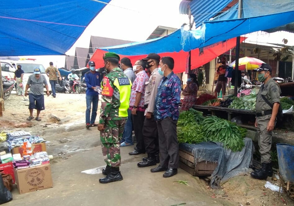 Aparat menyisir setiap sudut pasar sambil terus gencar mengingatkan pentingnya penggunaan masker kepada para pedagang maupun pengunjung pasar.
