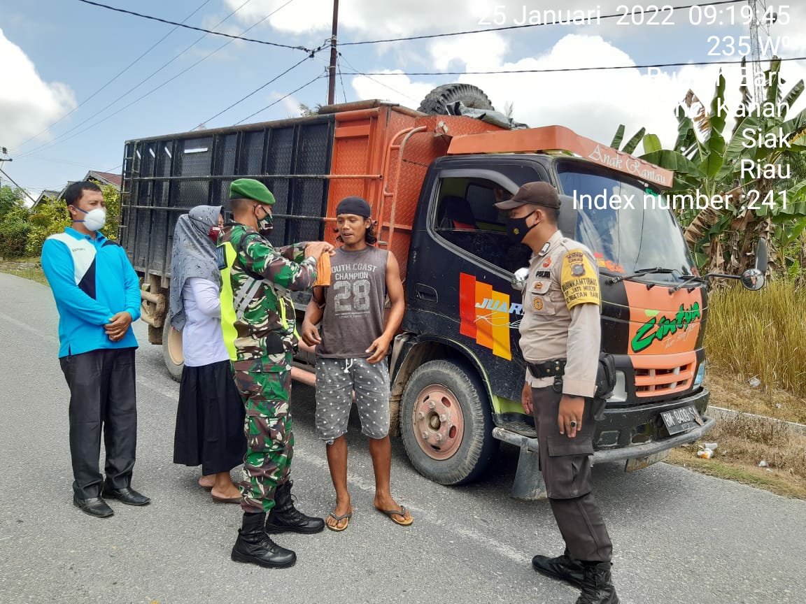 SIAK- Babinsa Koramil 01/Siak Jajaran Kodiam 0322/Siak Serka Junaidi bersama Bhabinkamtibmas melaksanakan kegiatan Protkes Covid-19 menghimbau kepada masyarakat Kampung Buantan Baru Kecamatan Kerinci Kanan, Kabuapaten Siak. Selasa, (25 Januari 2022)
