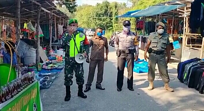 Mempura – Babinsa Koramil 03/Siak Kodim 0303/Bengkalis Serda Arianto bersama Babinkamtibmas dan Satpol PP , melaksanakan imbauan kepada warga binaan di Pasar Kaget, Kelurahan Sei. Mempura Kecamatan Mempura Kabupaten Siak, Jum’at (02/10/2020).