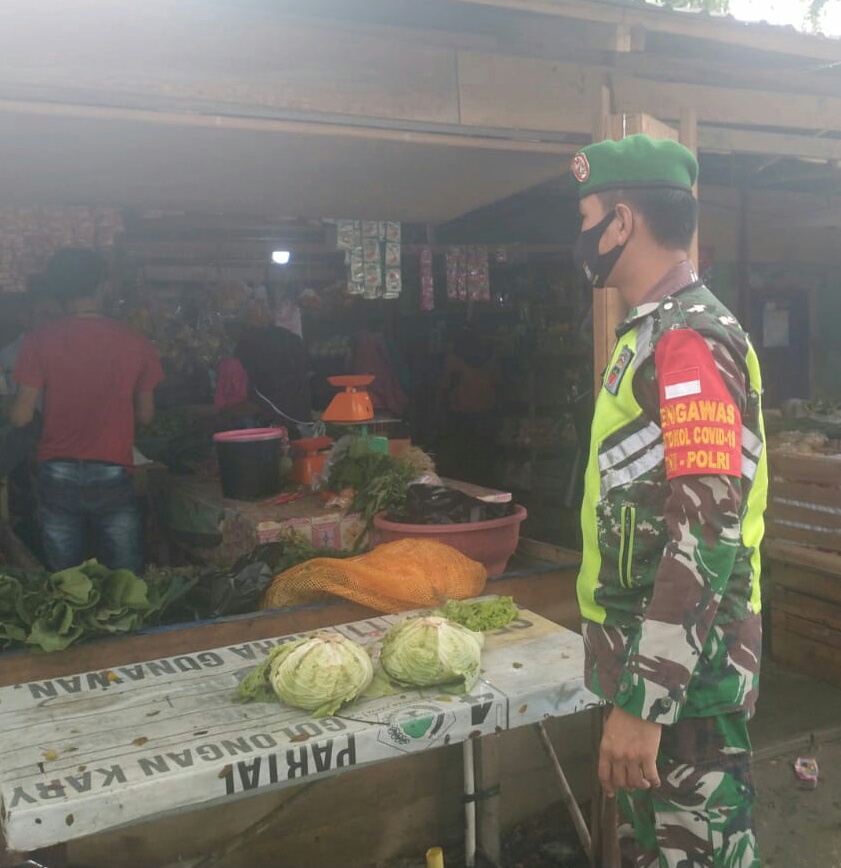 Babinsa Koramil 03/Siak Serda Darwis memberikan imbauan kepada pedagang agar dalam melaksanakan operasional jual beli agar menerapkan 3 M Memakai Masker, siap Mencuci Tangan dan Menjaga Jarak dan memberikan teguran kepada warga yang kedapatan tidak taat protokol kesehatan Covid-19, tidak menggunakan masker dan Jaga jarak pada saat berbelanja,