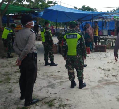 Kerinci Kanan – Para Babinsa di wilayah Koramil 03/Siak Kodim 0303/Bengkalis terus melaksanakan kegiatan pengawasan kepatuhan dan kedisiplinan warga terhadap protokol kesehatan Covid-19 di Pasar Tradisional Kampung Kumbara Utama Kecamatan Kerinci Kanan Kabupaten Siak, Sabtu, (10/04/2021).