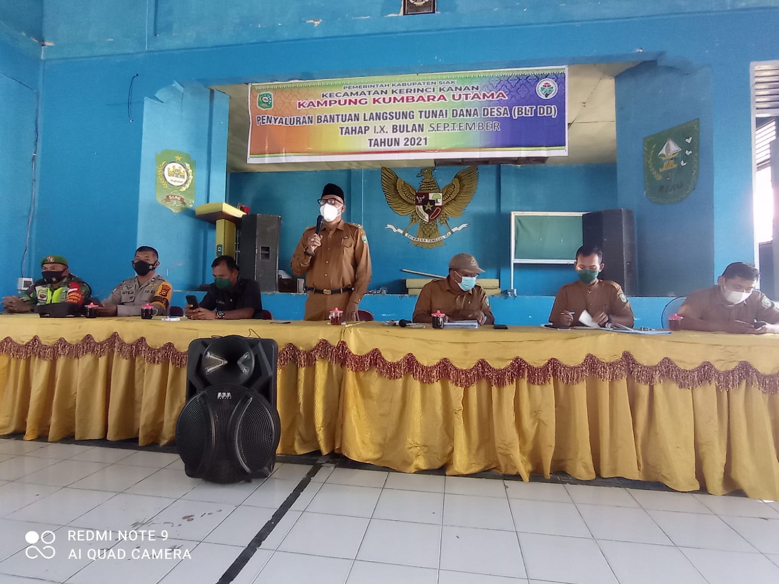 Kerinci Kanan – Babinsa Kampung Kumbara Utama Koramil 03/Siak Serda Ulong Ritonga bersama Bhabinkamtibmas dan perangkat Kampung melakukan pengawalan pembagian BLT bertempat di Aula Kantor Kampung Kumbara Utama Kecamatan Kerinci Kanan Kabupaten Siak, Senin (06/09/2021).