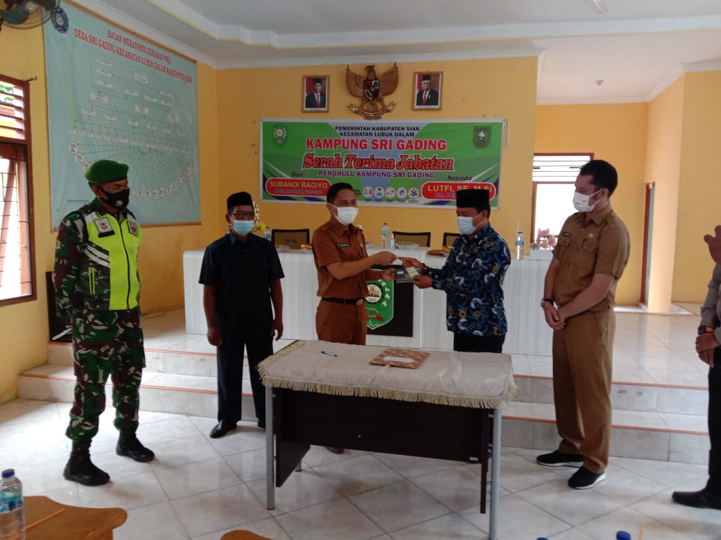 Lubuk Dakam – Babinsa Kampung Sri Gading Koramil 03/Siak Serda S. Nasution menghadiri Acara serah terima jabatan Penghulu Kampung Sri Gading dari Bpk. Subandi Bagio Kepada PJ Penghulu Bpk. Lutfi, SD, M. Si bertempat di Aula Kantor Penghulu Sri Gading Kecamatan Lubuk Dalam Kabupaten Siak, Senin (27/09/2021).