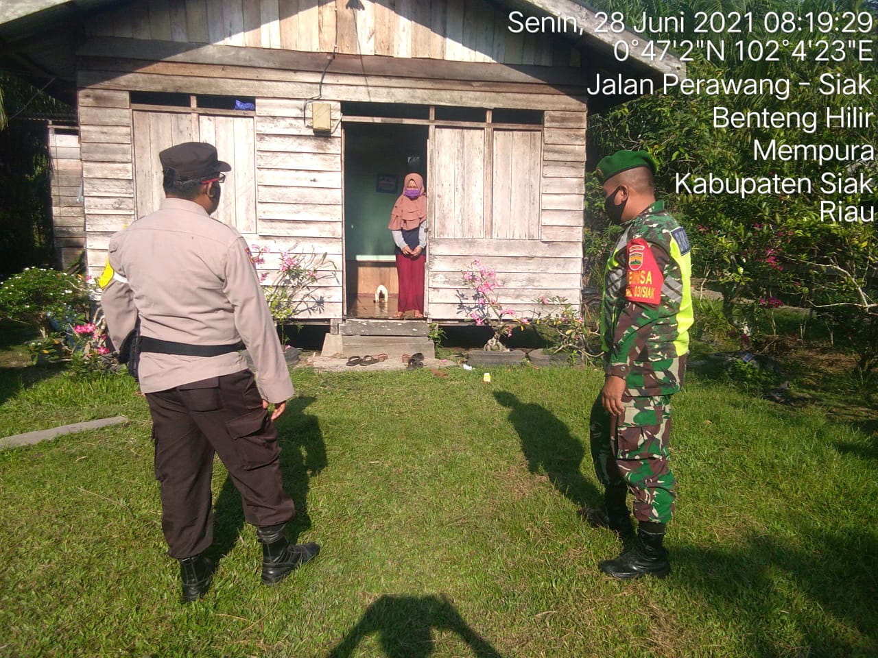 Mempura – Anggota Koramil 03/Siak Serda Arianto bersama Bhabinkamtibmas Bripka F. Dana melaksanakan pendampingan Tracking Kepada warga binaan yang kontak dengan pasien Covid 19, bertempat di Kampung Benteng Hilir Kecamatan Mempura Kabupaten Siak, Senin (28/06/2021).
