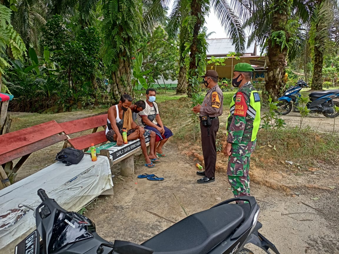 SIAK- Babinsa Koramil 01/Siak Jajaran Kodim 0322/Siak Serda Ulong Ritongga bersama Bhabinkamtibmas melaksanakan kegiatan pendisiplinan Protokol Kesehatan kepada Masyarakat yang melaksanakan kerumunan di Kampung Delima Jaya Kecamatan Kerinci Kanan, Kabupaten Siak. Minggu, 20 Februari 2022.