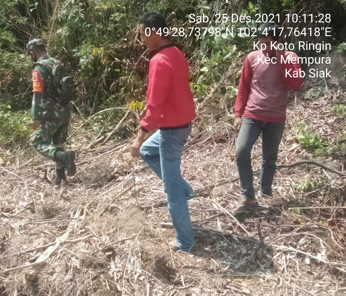 SIAK- Anggota Koramil 01/Siak, Kodim 0322/Siak Serka Irwan dan Masyarakat Peduli Api(MPA) kampung Koto Ringin melaksanakan Patroli dan Sosialisasi Karhutla pencegahan Kebakaran Hutan dan Lahan (Karhutla) di Kampung Koto Ringin Kecamatan Mempura Kabupaten Siak. Sabtu, (25/12/2021)