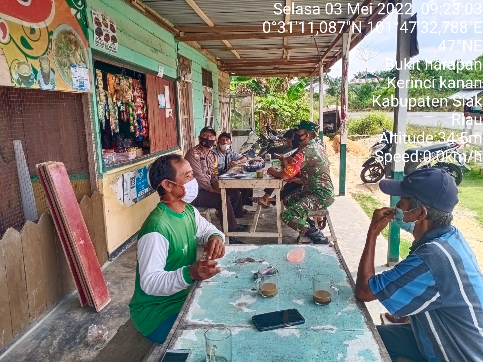 SIAK-Babinsa Koramil 01/Siak jajaran Kodim 0322/Siak Serda Ulong R Ritong melaksanakan kagiatan komsos dan himbauan protkes kepada Masyarakat Kp.Bukit Harapan, Kec.Kerinci Kanan Kab.Siak.Kegiatan dilaksanakan pada Selasa,03 Mei 2022