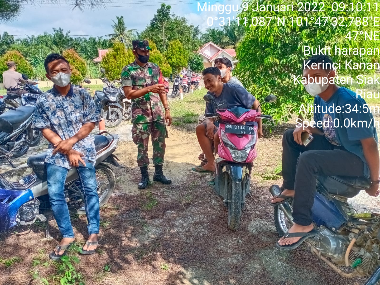 SIAK- Angota Koramil 01/Siak Kodim 0322/Siak Serda Ulong Ritonga terus melakukan kegiatan penegakan disiplin protokol kesehatan (Prokes) 5M dalam upaya percepatan penanganan dan pencegahan penyebaran Covid-19 di Kampung Bukit Harapan Kecamatan Kerinci kanan Kabupaten Siak. Minggu, 09 Januari 2022.