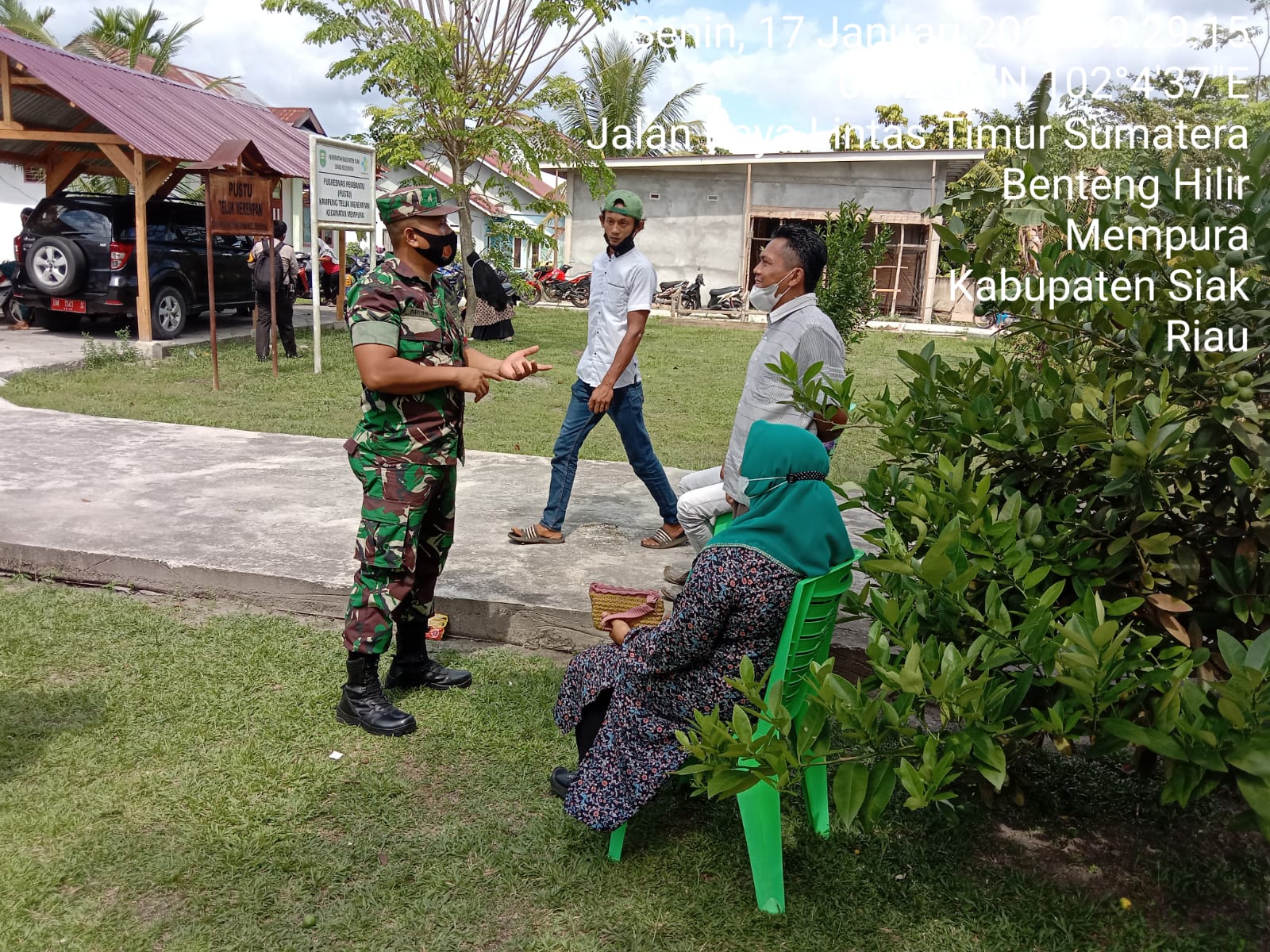 SIAK- Untuk menjalin silatuhrahmi kepada warga binaan, Babinsa Koramil 01/Siak Kodim 0322/Siak Serda Ariyanto melaksanakan kagiatan Komsos dan himbauan protkes kepada Masyarakat Kampung Benteng Hilir Kecamatan Mempura, Kabupaten Siak. Senin,17 Januari 2022.
