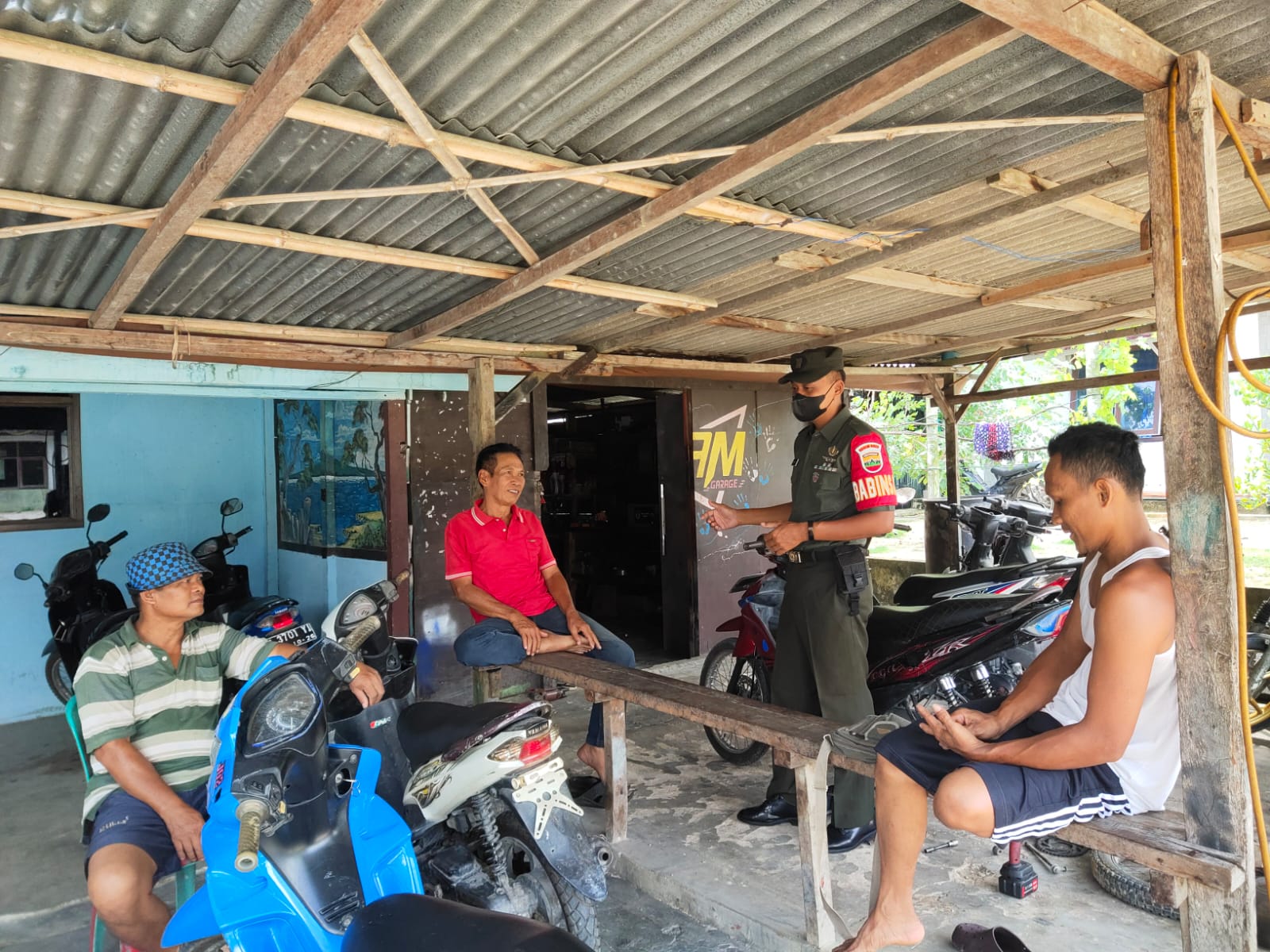 SIAK- Babinsa Koramil 01/Siak Kodim 0322/Siak Sertu Warto melaksanakan Komsos dengan masyarakat dengan mengajak warga Desa binaan tetap mematuhi protokol kesehatan, saat melaksanakan komunikasi sosial (komsos) di Kampung Srigading, Kecamatan Lubuk Dalam, Kabupaten Siak, Kamis (29/9/2022).