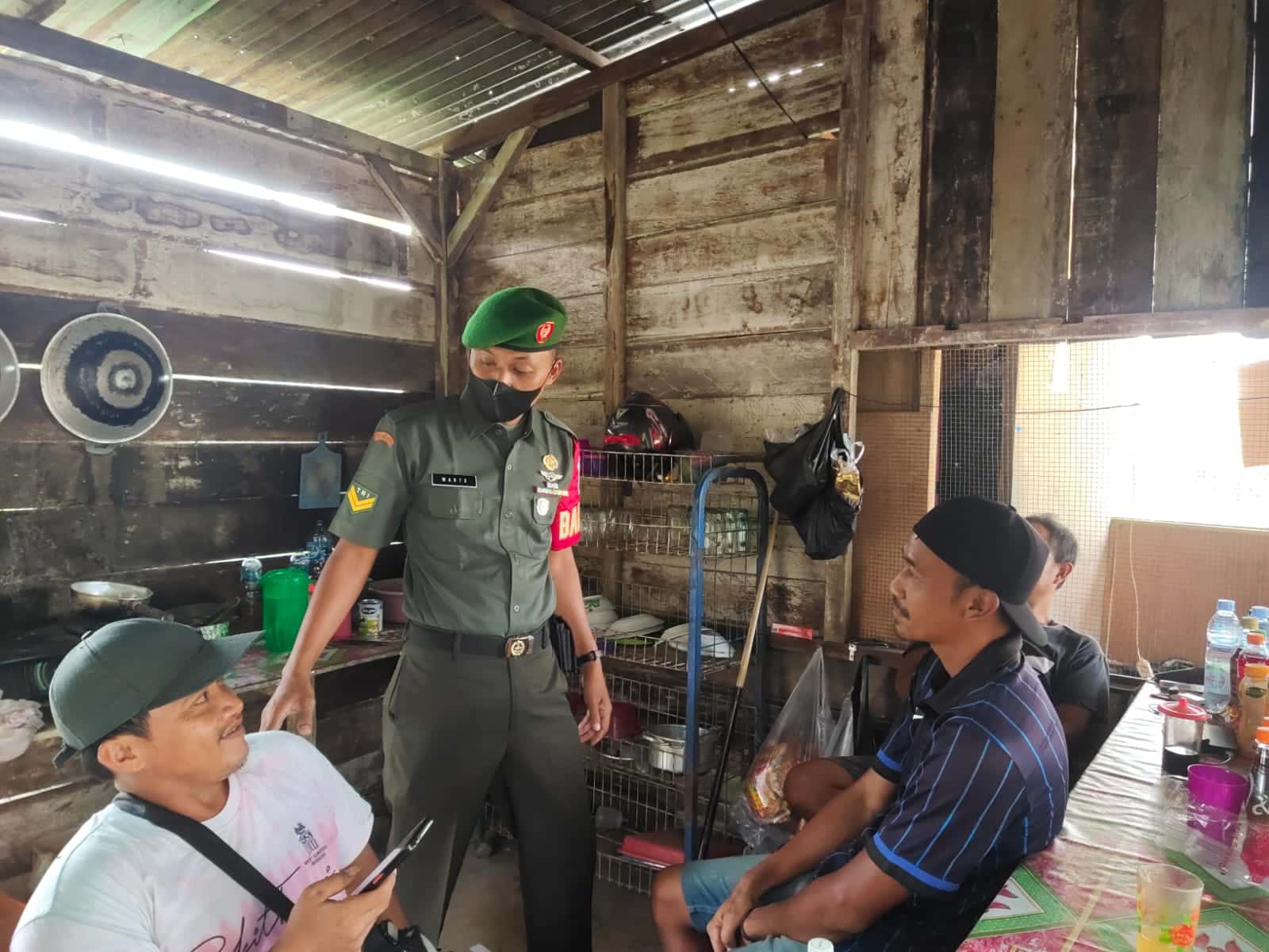 SIAK- Babinsa Koramil 01/Siak Kodim 0322/Siak Sertu Warto melaksanakan Komsos dengan masyarakat dengan mengajak warga Desa binaan tetap mematuhi protokol kesehatan, saat melaksanakan komunikasi sosial (komsos) di Kampung Srigading, Kecamatan Lubuk Dalam, Kabupaten Siak, Kamis (22/9/2022).