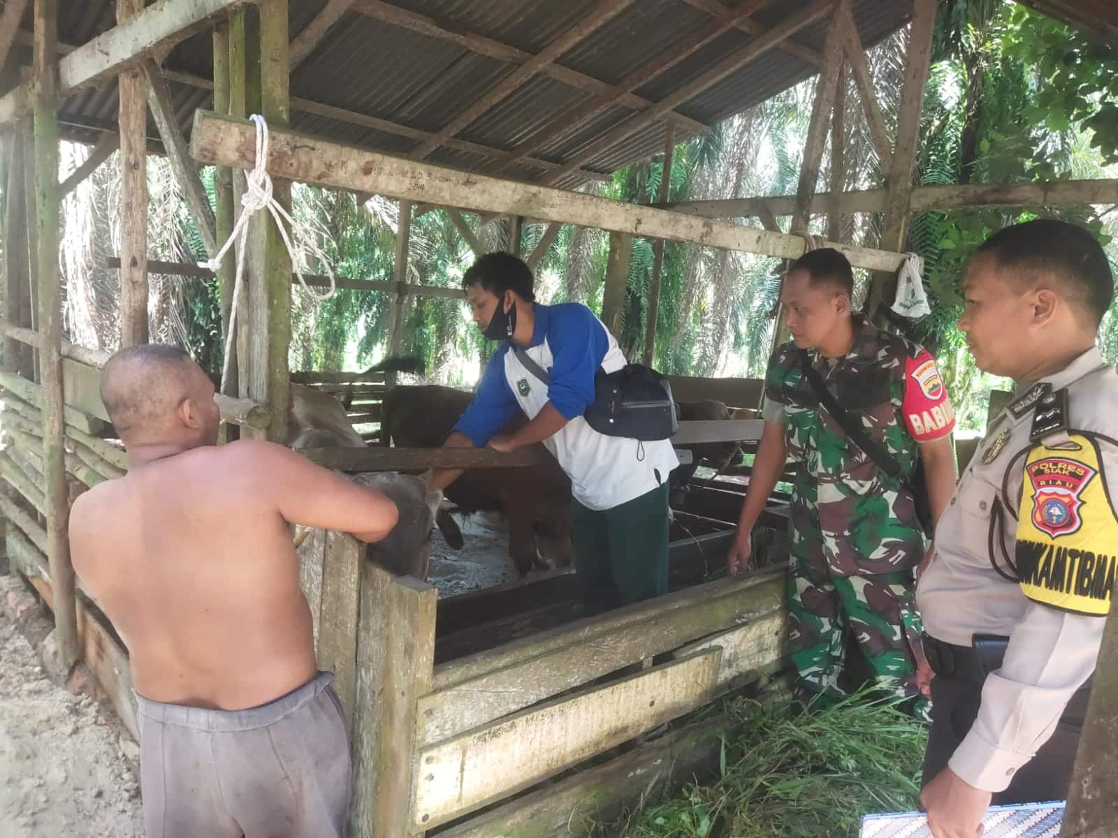 SIAK- Babinsa Koramil 01/Siak, Kodim 0322/Siak Sertu Warto melaksanakan Pendampingan Vaksin PMK ternak sapi di Kampung, Sialang Palas, Kecamatan Lubuk Dalam, Kabupaten Siak, Selasa. (20/9/2022).