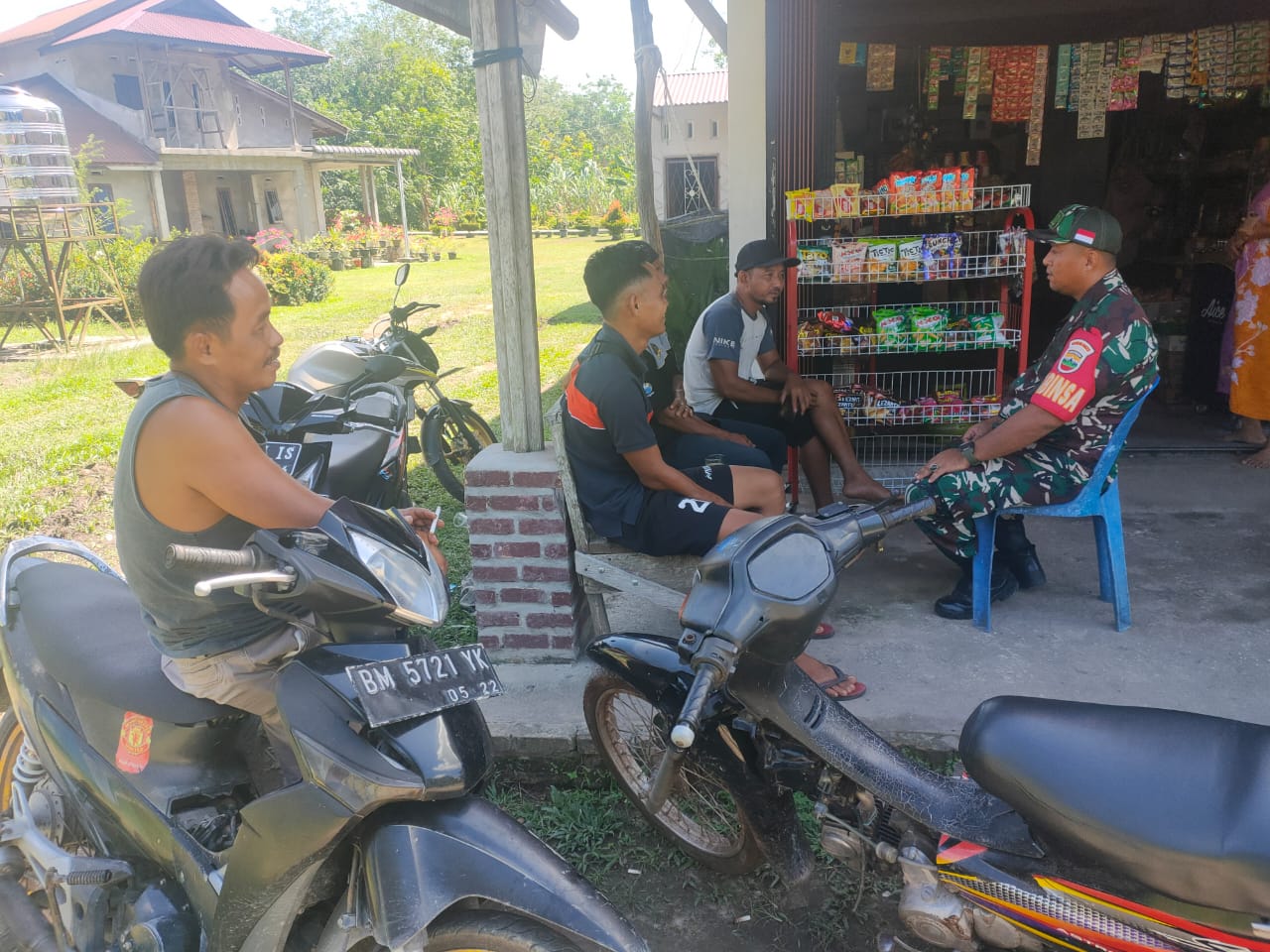 SIAK- Babinsa Koramil 01/Siak Kodim 0322/Siak Serda Siburian melaksanakan kegiatan Komsos dan himbauan Prokes kepada masyarakat Kampung Simpang Perak Jaya, Kecamatan Kerinci Kanan, Kabupaten Siak. Minggu, 14 agustus 2022.