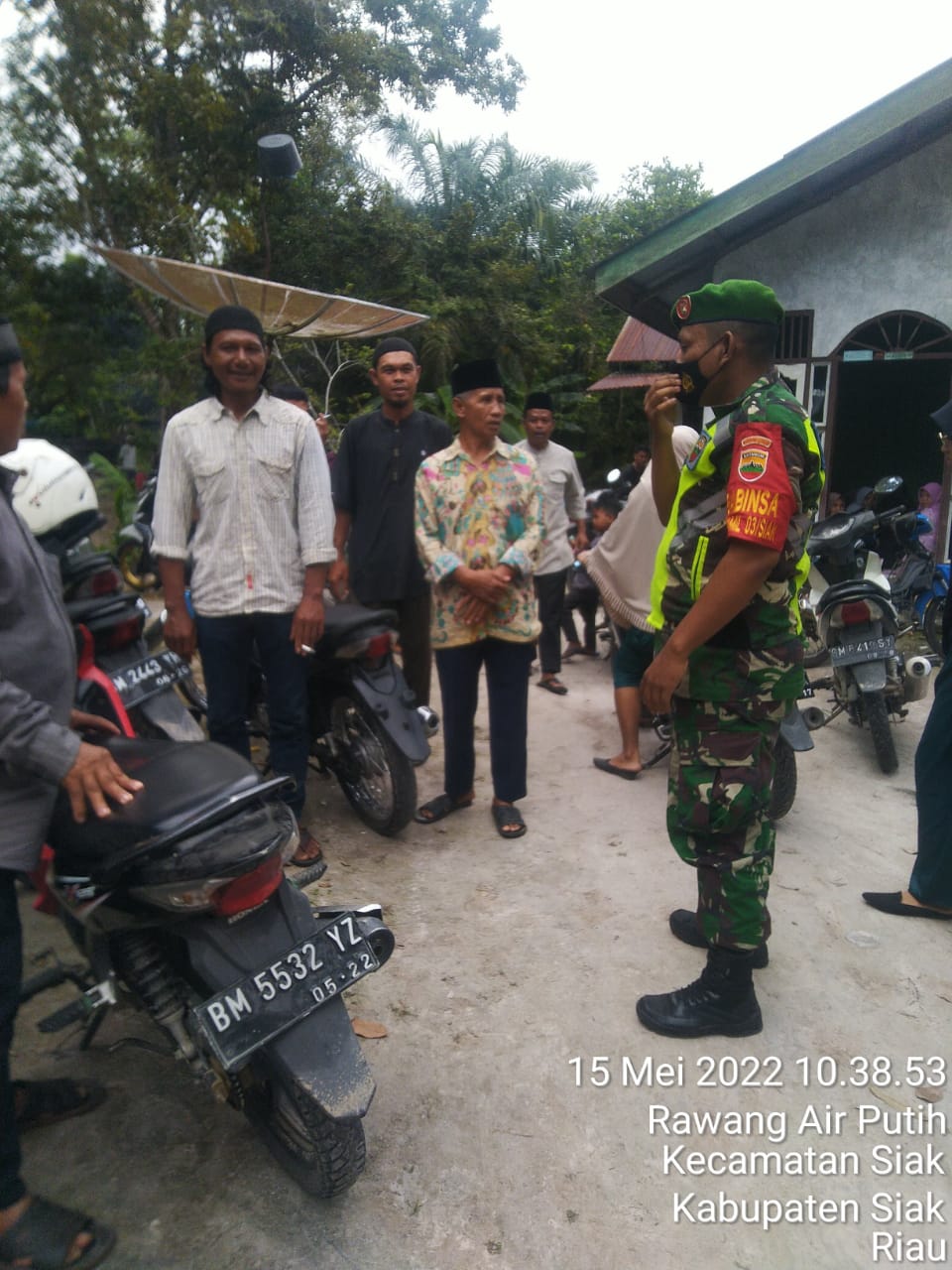 SIAK- Babinsa Koramil 01/Siak jajaran Kodim 0322/Siak Kopda Ardhi Bagus melaksanakan kegiatan Protkes menghimbau kepada masyarakat Kampung Rawang Air Putih Kecamatan Siak Kabupaten Siak. Minggu 15 Mei 2022.