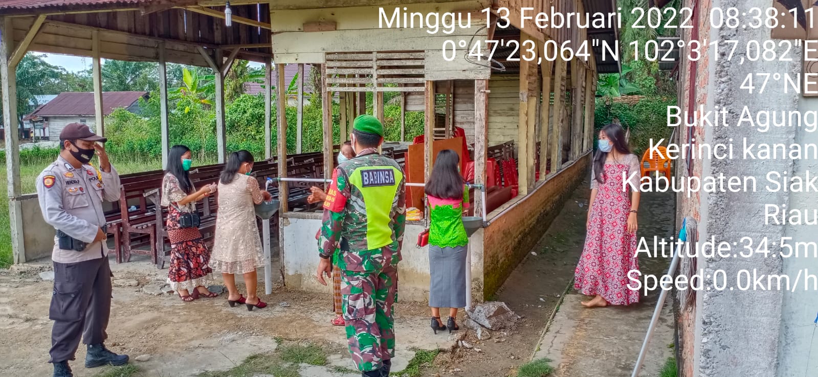 SIAK- Babinsa Koramil 01/Siak Jajaran Kodim 0322/Siak Serda Ulong Ritongga melaksanakan kegiatan himbauan Protokol Kesehatan dengan menghimbau kepada masyarakat untuk tetap menggunakan masker si saat Beraktivitas di luar rumah. Giat himbauan ini di Kampung Bukit Agung, Kecamatan Kerinci Kanan, Kabupaten Siak. Minggu, 13/2/2022.