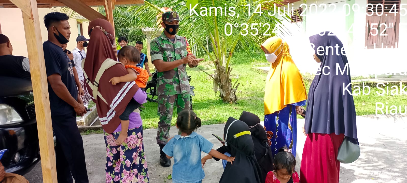 SIAK- Babinsa Koramil 01/Siak, Kodim 0322/Siak Serda Jam Simatupang melaksanakan kagiatan komsos dan himbauan protkes kepada Masyarakat Kampung Benteng Hulu Kecamatan Mempura Kabupaten Siak. Kamis,14 Juli 2022.