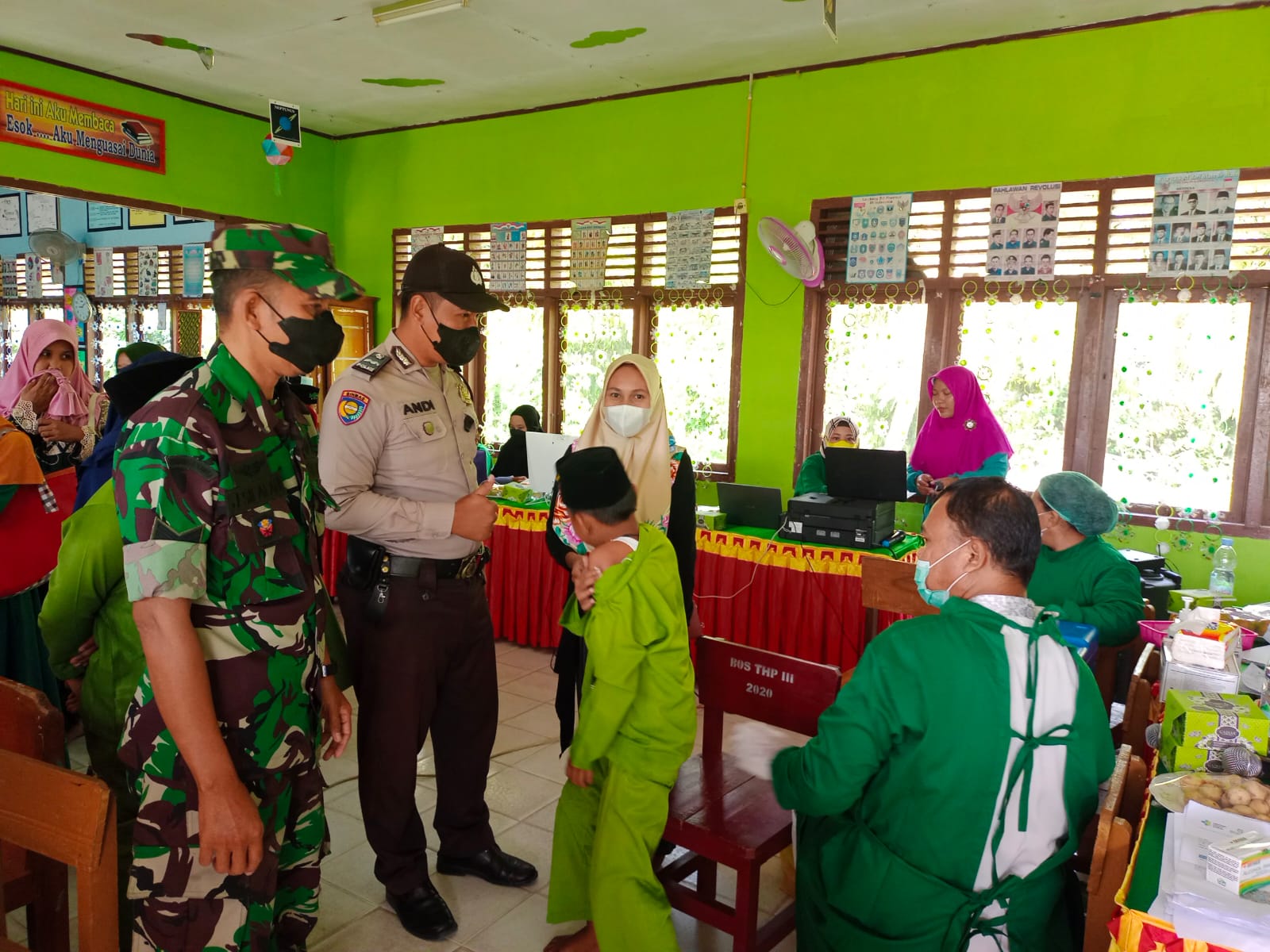 Babinsa Koramil 01 Siak dan Bhabinkamtibmas Melaksanakan Kegitan Pengamanan Serbuan Vaksinasi Massal Untuk Umur 6-11 Tahun