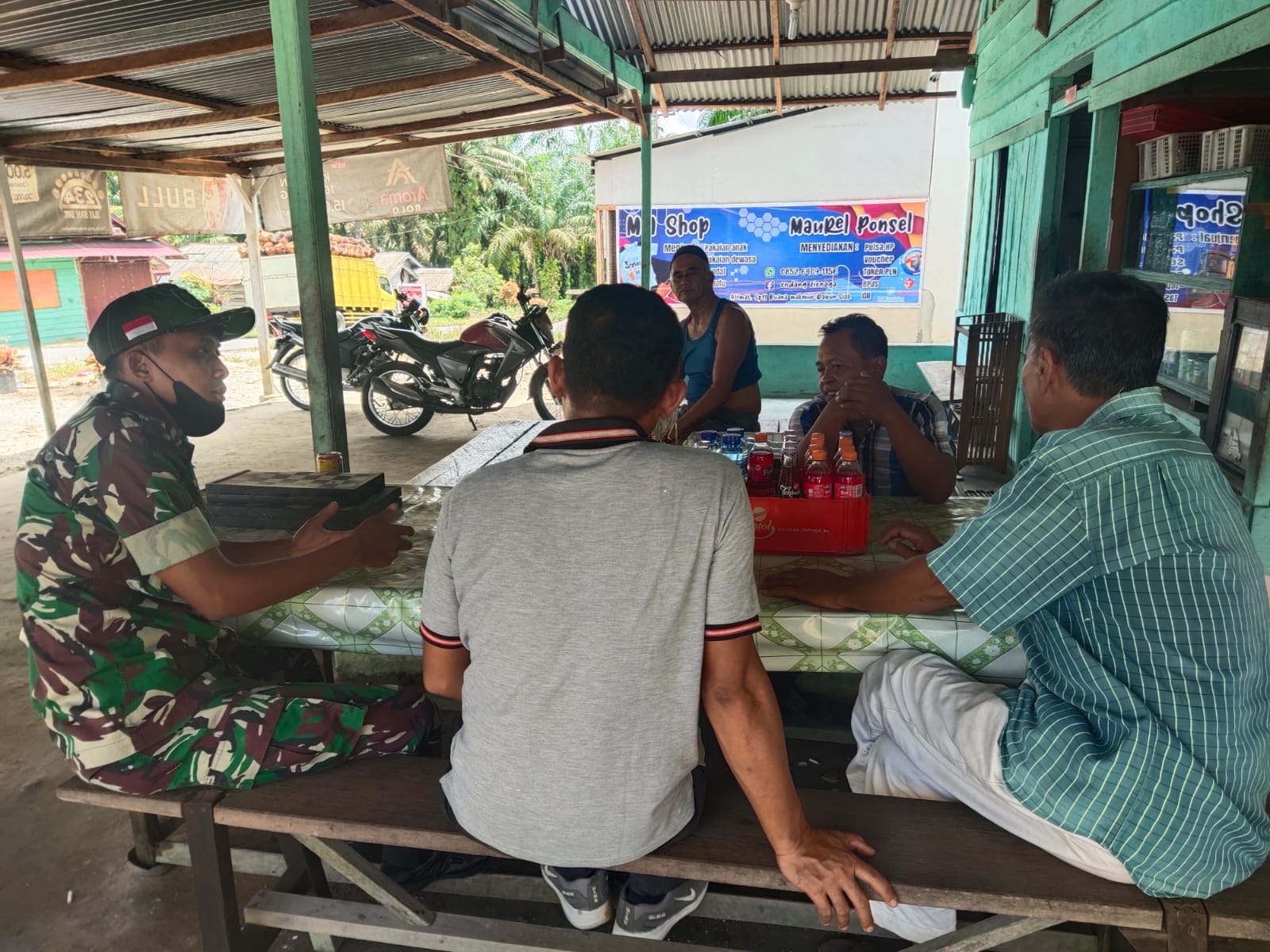 SIAK- Babinsa Koramil 01/Siak Kodim 0322/Siak Sertu Warto melaksanakan Komsos dengan masyarakat dengan mengajak warga Desa binaan tetap mematuhi prokes, saat melaksanakan komunikasi sosial (komsos) di Kampung Srigading, Kecamatan Lubuk Dalam, Kabupaten Siak, Selasa (13/9/2022).