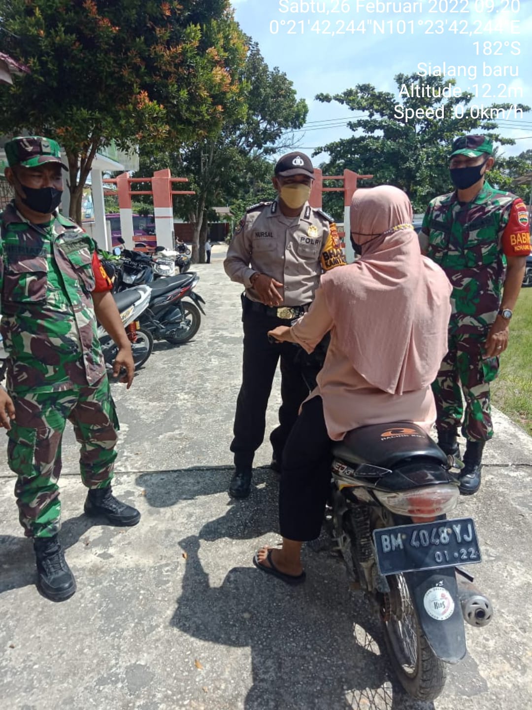 SIAK- Dalam rangka memutus mata rantai penyebaran Covid – 19, Babinsa Koramil 01/Siak Jajaran Kodim 0322/Siak Serda Heriadi bersama Bhabinkamtibmas melaksanakan kegiatan menghimbau Protokol Kesehatan kepada masyarakat Kampung Sialang Baru Kecamatan Lubuk Dalam Kabupaten Siak. Sabtu, 26 Februari 2022.