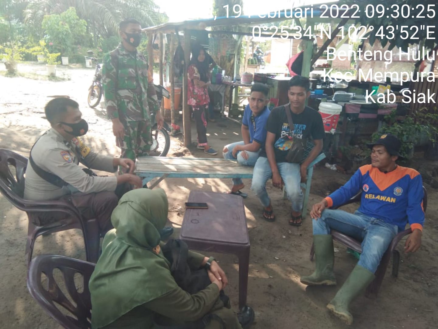 SIAK- Babinsa Koramil 01/Siak Jajaran Kodim 0322/Siak Serda Jam Simatupang dan Bhabinkamtibmas melaksanakan kagiatan Komsos dan himbauan protkes kepada Masyarakat Kampung Benteng Hulu Kecamatan Mempura Kabupaten Siak. Sabtu,19 Februari 2022.