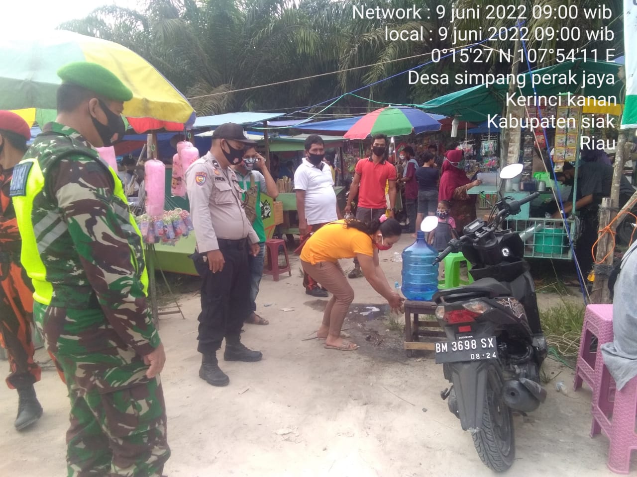 SIAK- Upaya untuk memutuskan penularan covid19, Babinsa Koramil 01/Siak jajaran Kodim 0322/Siak Serda Alberd C Siburian bersama Bhabinkamtibmas tidak ada henti hentinya melaksanakan kegiatan himbauan Protokol Kesehatan kepada masyarakat dipasar tradisional di Kampung Simpang Perak Jaya Kecamatan Kerinci Kanan Kabupaten Siak. Kamis .09 Juni 2022.