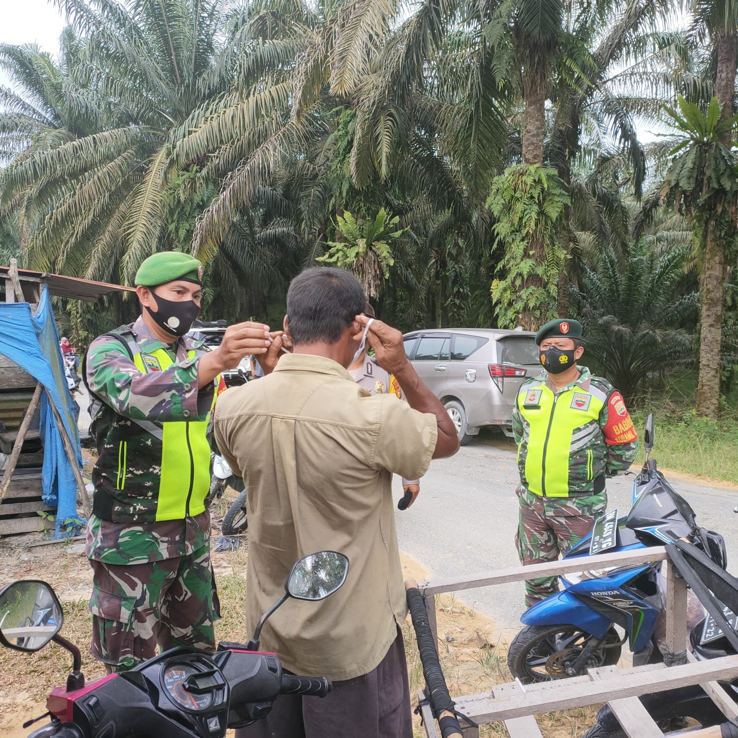Kerinci Kanan – Babinsa Kampung Simpang Perak Jaya Koramil 03/Siak Kodim 0303/Bengkalis Serda Albert Siburian bersama rekan Babinsa lainnya melaksanakan imbauan protokes sekaligus membagikan masker gratis kepada pedagang dan pengunjung pasar tradisional Simpang Perak Jaya Kecamatan Kerinci Kanan Kabupaten Siak,Rabu (10/11/2021).