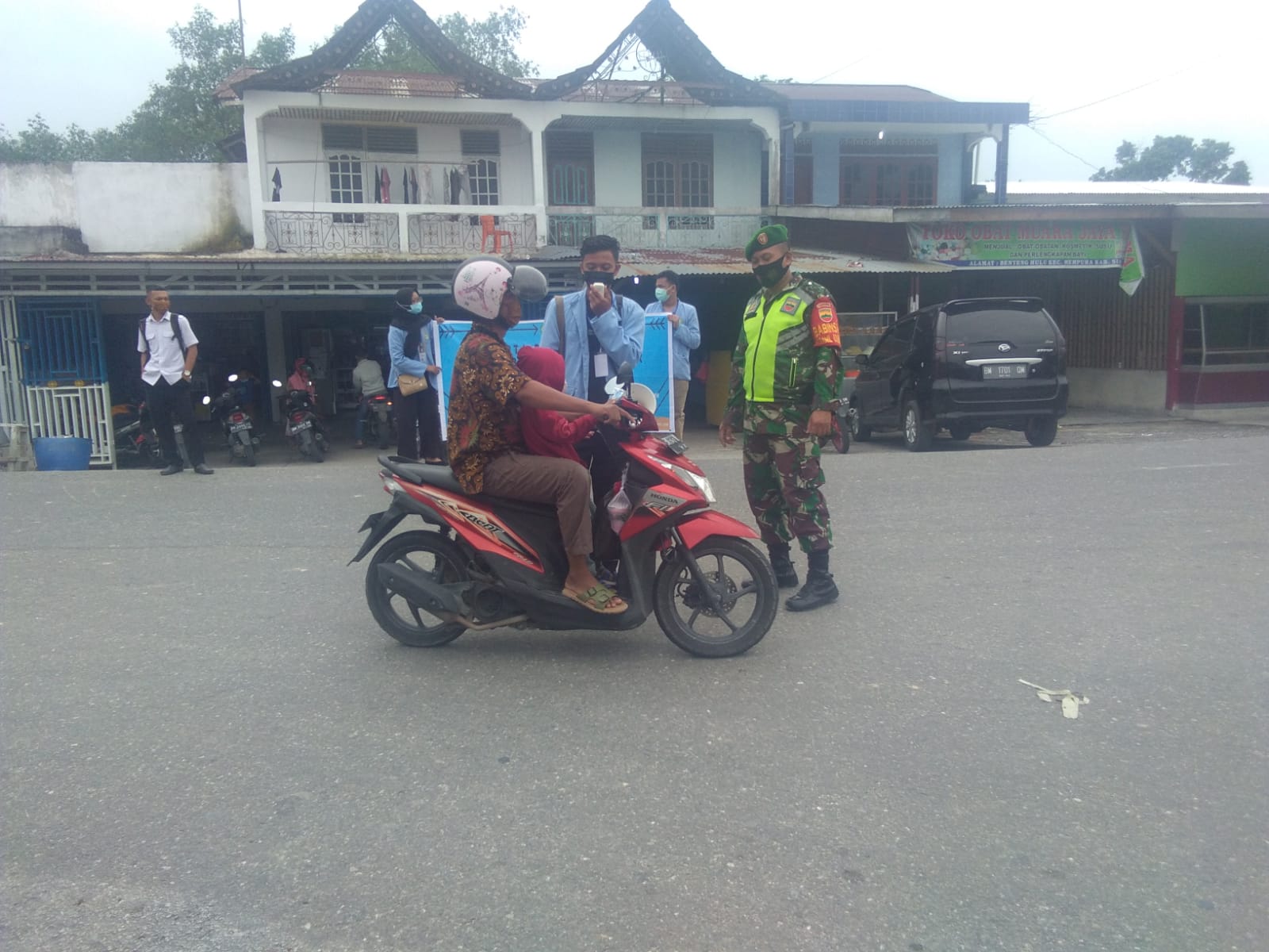 Mempura – Untuk mencegah penyebaran virus corona (covid-19)di wilayah Koramil 03/Siak Kodim 0303/Bengkalis bersama Mahasiswa UNRI melaksanakan himbauan penegakan disiplin mematuhi protokol kesehatan dan bagi-bagi masker di Jln. Sudirman Kampung Benteng Hulu Kecamatan Mempura Kabupaten Siak, Jum’at (16/07/2021).