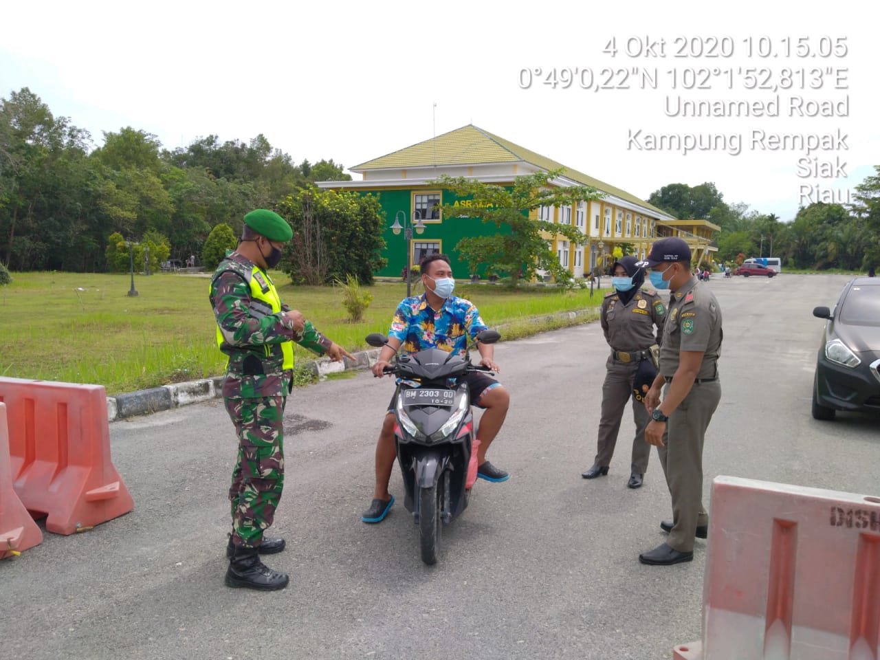 SIAK – Guna mencegah dan memperketat gerak maju pasien Covid 19 untuk tidak beraktifitas diluar seperti biasanya. Aparat gabungan TNI dan Satpol PP Kabupaten Siak mengawasi dan mengamankan tempat isolasi pasien Covid 19 di Asrama Haji Kelurahan Kampung Rempak Kecamatan Siak. Senin, (05/10/2020).