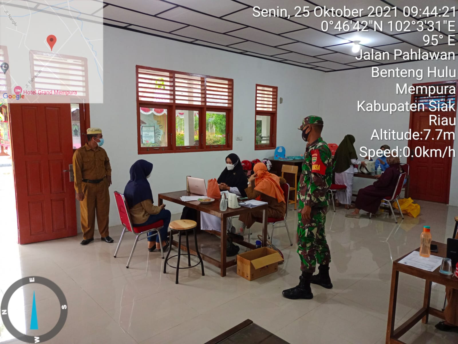 Mempura – Personel Koramil 03/Siak Serda J. Simatupang selaku Babinsa Kampung Benteng Hulu Kecamatan Mempura melaksanakan monitoring terhadap kegiatan Vaksinasi Dosis 2 bagi Para Guru SMP UPTD Kecamatan Mempura yang dilaksanakan oleh UPT Puskesmas Mempura bertempat di SMP Negeri 1 Kampung Benteng Hulu Kecamatan Mempura Kabupaten Siak, Senin (25/10/2021).