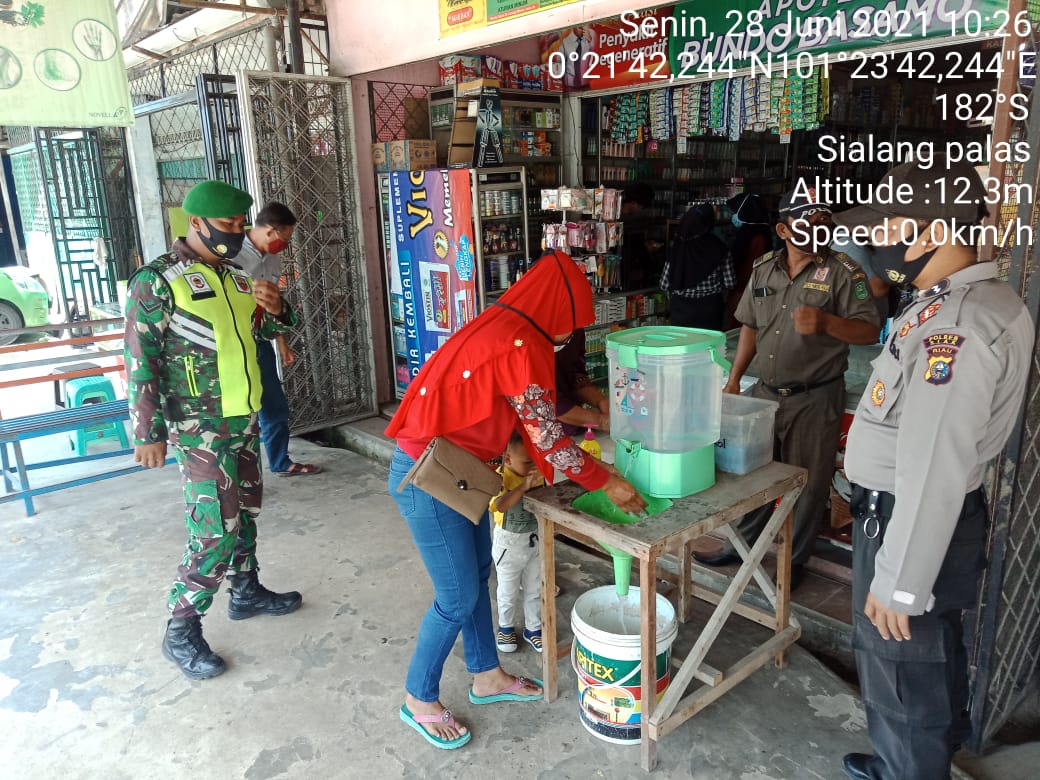 Untuk menekan laju persebaran Covid-19 di wilayah Kecamatan Lubuk Dalam Kampung Sialang Palas aparatur gabungan dari Koramil 03/Siak,Bhabinkamtibmas dan Satpol PP menggencarkan operasi yustisi serta sosialisasi protokol kesehatan dengan sasaran para pedagang serta pengunjung di pasar siang ini.