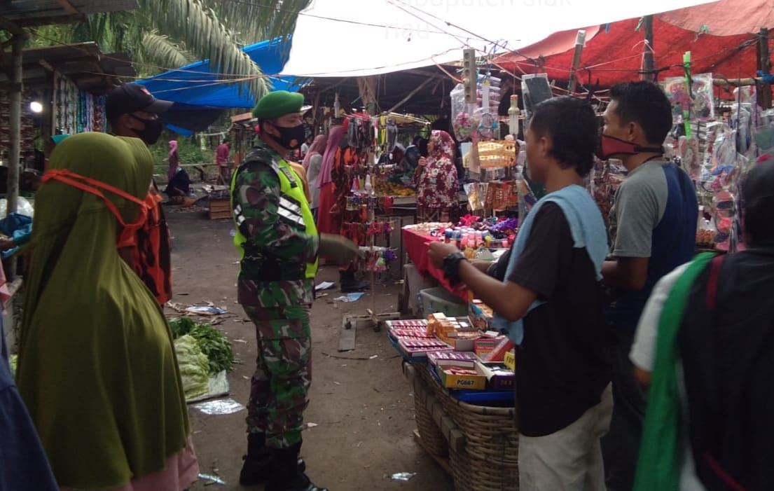 Guna menekan laju penyebaran wabah Covid-19 di wilayah Kecamatan Lubuk Dalam, Babinsa Koramil 03/Siak Serda Heriadi menggencarkan operasi yustisi serta sosialisasi protokol kesehatan dengan sasaran para pedagang serta pengunjung di pasar Tradisional Kampung Sialang Baru.