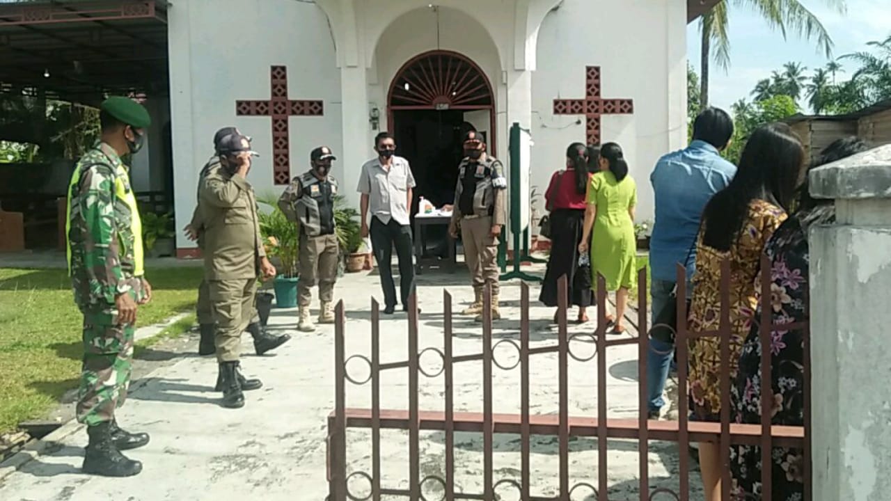 Siak – Babinsa Koramil 03/Siak Serma Joni bersama Anggota Satpol PP Kab. Siak, melakukan pendisiplinan terhadap masyarakat yang sedang melaksanakan ibadah Minggu, tidak hanya pendisiplinan, Babinsa juga melaksanakan Pengawasan penerapan protokol kesehatan di sejumlah Gereja yang berada di wilayah teritorial Koramil 03/Siak, Minggu (28/03/2021).