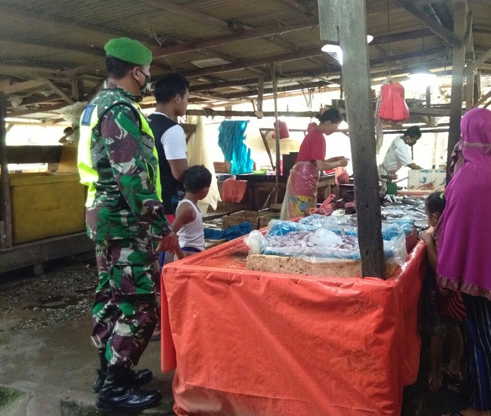 SIAK – Babinsa Koramil 03/Siak Serda S. Siburian melaksanakan kegiatan penerapan disiplin Protokol Kesehatan (Prokes) di Pasar Tradisional Kampung Simpang Perak Jaya Kecamatan Kerinci Kanan Kabupaten Siak, Sabtu (16/01/2021).