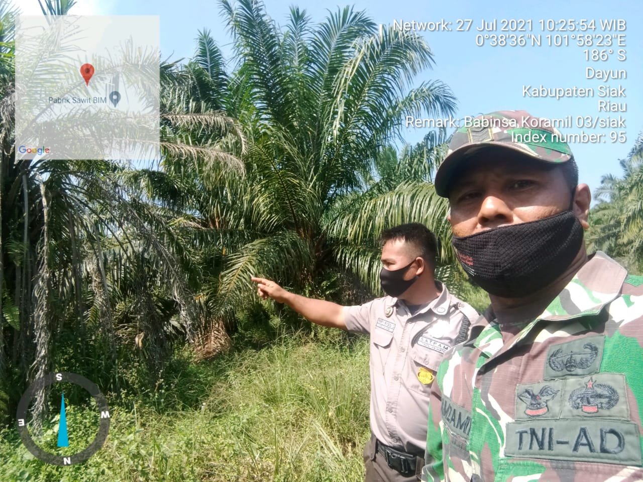 Dayun – Tingkatkan pengawasan dan pengendalian kebakaran hutan dan lahan (Karhutla) Babinsa Koramil 03/Siak Kodim 0303/Bengkalis Serma Zamzami bersama Security PT. BIM melakukan patroli dan pengecekan titik hotspot di Kampung Dayun Kecamatan Dayun Kabupaten Siak, Selasa (27/07/2021).