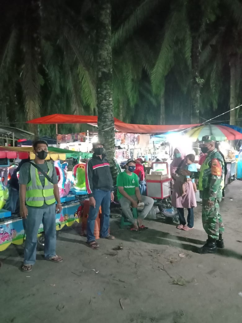 Sebagaimana yang dilakukan Babinsa Jajaran Koramil 03/Siak Serma Zamzami bersama pengurus pasar melaksanakan Patroli Keamanan dan memantau kepatuhan warga masyarakat tentang prtokol kesehatan di pasar kaget pada malam hari, Rabu (04/08/2021).