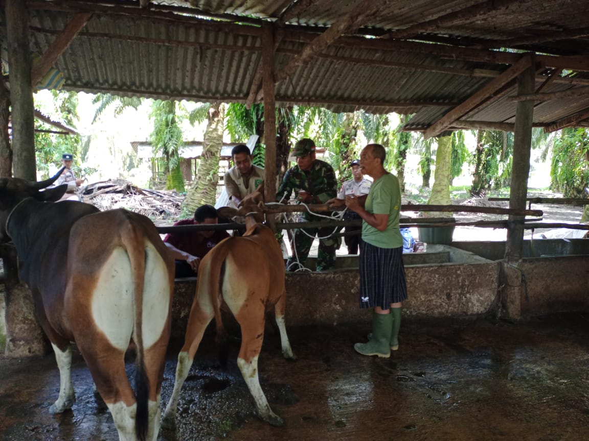 SIAK, Babinsa Koramil 01/Siak, Kodim 0322/Siak Koptu Elpan Permana melaksanakan Pendampingan Vaksin PMK ternak sapi di Kampung Benteng Hilir, Kecamatan Mempura, Kabupaten Siak, Jumat, (25/11/2022).