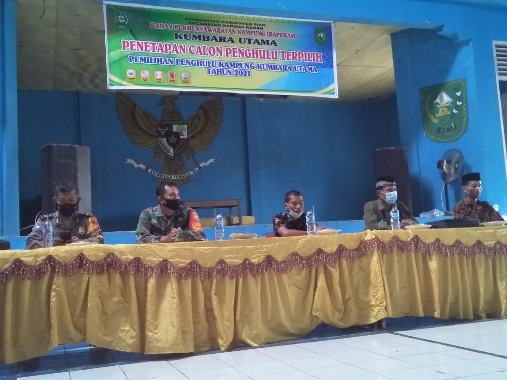 Kerinci Kanan – Panitia pelaksana pemilihan Kepala Kampung (PILKAMPUNG) secara serentak di Kabupaten Siak, Babinsa Kampung Kumbara Utama Koramil 03/Siak Serda Ulong Ritonga mewakili Danramil 03/Siak menghadiri undangan Rapat Pleno Penetapan Penghulu Terpilih dalam pelaksanaan pemilihan tahun 2021 Kampung Kumbara Utama Kecamatan Kerinci Kanan Kabupaten Siak, Kamis (18/11/2011).