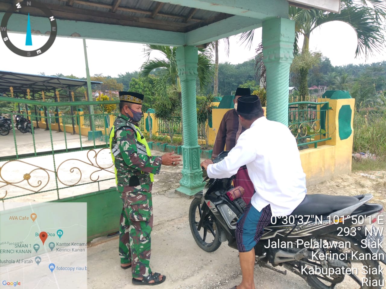 Kerinci Kanan – Babinsa Koramil 03/Siak Kodim 0303/Bengkalis Serma Erianto bersama pengurus Masjid turut serta melaksanakan Pemantauan Penerapan Disiplin Protokol Kesehatan.